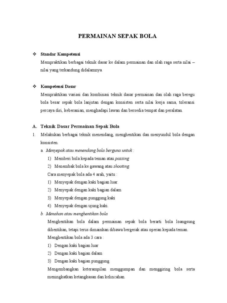 Umumnya, sepak bola memiliki lama waktu permainan 2×45 menit dengan istirahat sebanyak 15 menit. Berikut adalah berbagai teknik dasar sepak bola yang bisa kamu pelajari. Sepak bola adalah permainan tim bukan individu, sehingga teknik mengoper bola perlu kamu kuasai dengan baik. Dalam bermain sepak bola kita tidak boleh. Teknik dasar bermain sepakbola salah satu cabang permainan olahraga yang paling banyak peminatnya adalah sepak bola.